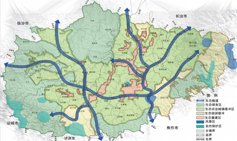 與中國城市規(guī)劃設(shè)計(jì)研究院合作規(guī)劃經(jīng)過充分調(diào)研,確定了晉城市為全國無煙煤基地和潔凈能源基地,山西省煤化工基地和電力生產(chǎn)基地的發(fā)展定位,根據(jù)產(chǎn)業(yè)發(fā)展、生態(tài)環(huán)境保護(hù)要求,設(shè)立產(chǎn)業(yè)準(zhǔn)入門檻和要求,提出了“三區(qū)、四軸、三極”的產(chǎn)業(yè)空間新格局。在產(chǎn)業(yè)發(fā)展的同時(shí)要加大生態(tài)環(huán)境保護(hù)力度,控制污染工業(yè)發(fā)展規(guī)模與總量,嚴(yán)禁高污染工業(yè)的再布局。積極發(fā)展生態(tài)旅游業(yè),著重打造太行絕頂旅游區(qū)、丹河旅游區(qū)、城郊旅游區(qū)、沁河旅游區(qū)、歷山旅游區(qū)五大旅游區(qū)。